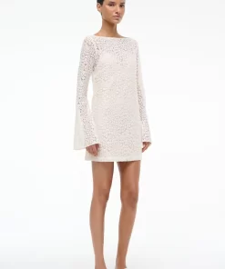 The Maya is a boat neck mini dress featuring bell sleeves and an open back. This style is crafted in our tiny bloom floral lace and comes with a removable slip.