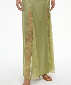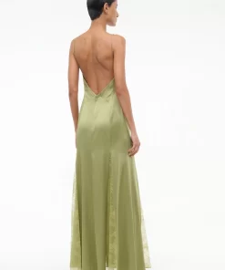 The Trinity is a maxi length slip dress with lace inserts down the front and back of the skirt. It features a v-neckline, low back and spaghetti straps.