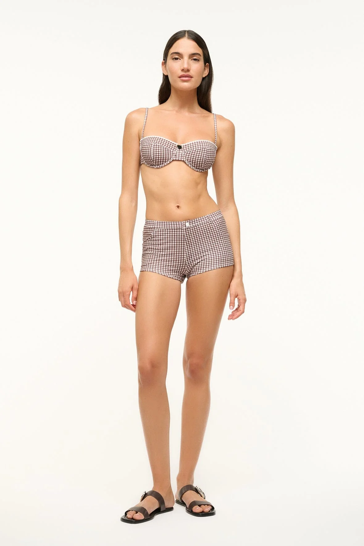 The Cod Bikini Bottom is Staud Sea’s first swim boyshort. This style is mid-rise and features a faux button-fly detail and offers full back coverage.
