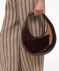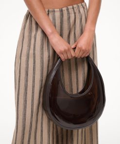 This is an espresso colored PVC Moon Bag with a leather trim. This style features a removable STAUD-embossed handle accent and a magnetic snap closure.