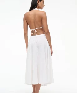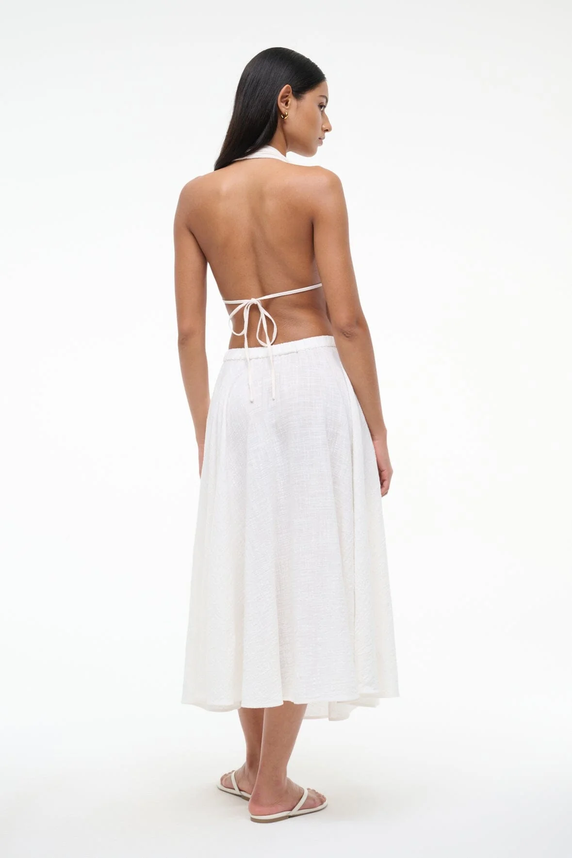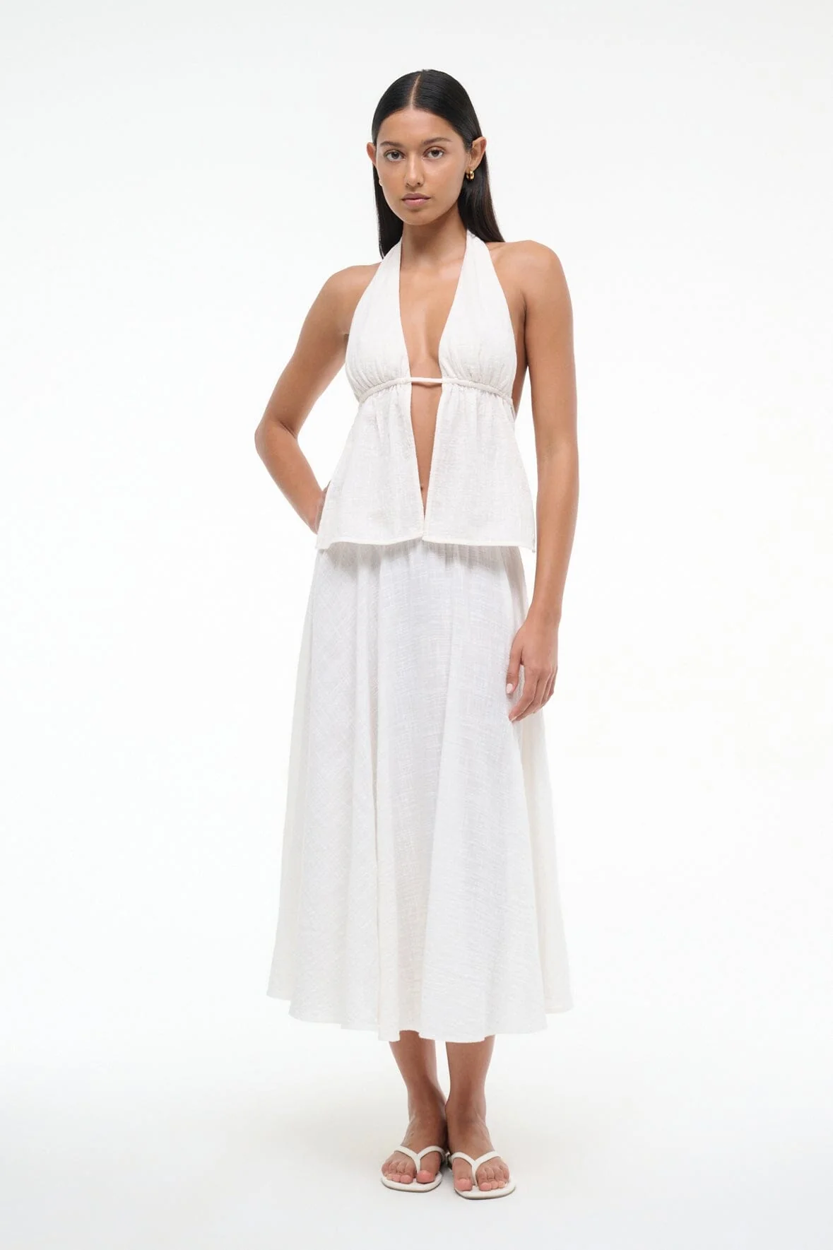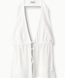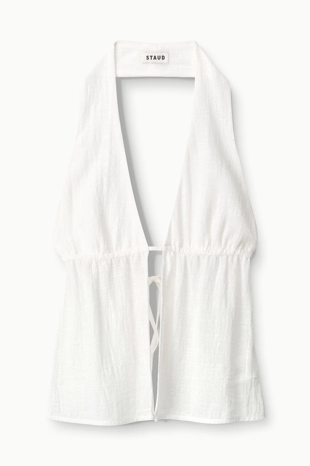 The Flores Top is a flowy swim coverup in our cotton gauze, featuring a halter neckline, a plunging v-neckline with an open front and string detailing at the waist. This style features an open back with a tie.