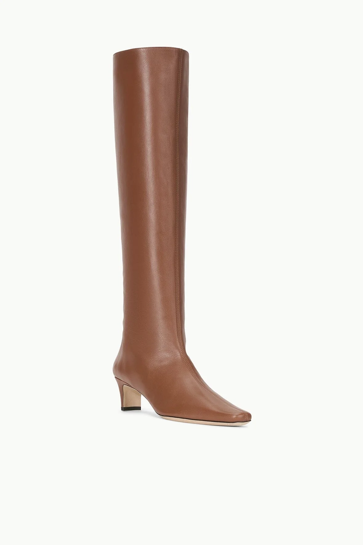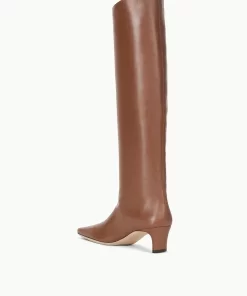 The Wally is a leather knee-high boot featuring a pointed toe and a slim heel design.