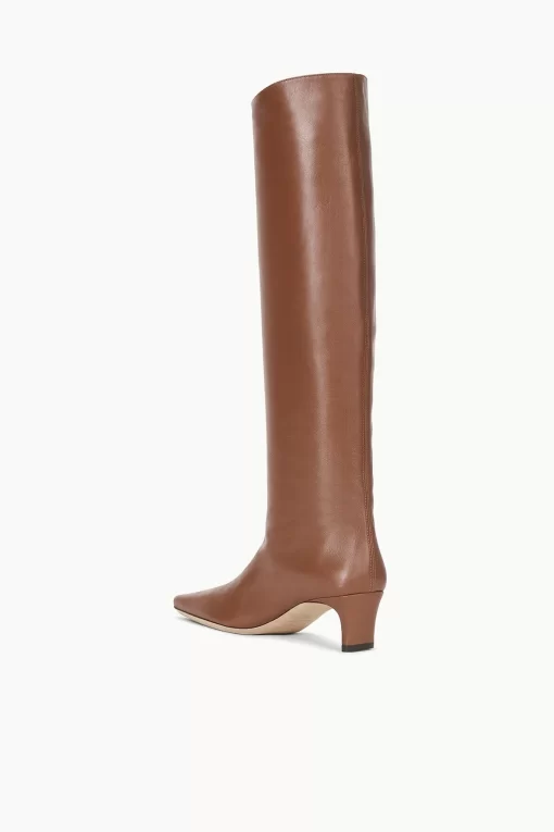 The Wally is a leather knee-high boot featuring a pointed toe and a slim heel design.