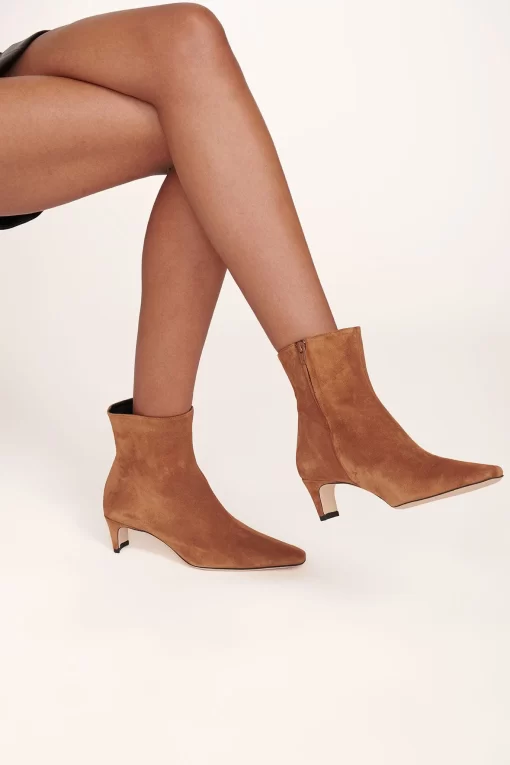 A suede ankle boot, this style features a pointed rectangular toe and a blade heel. The Wally Ankle boot features a side zip closure.
