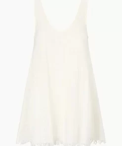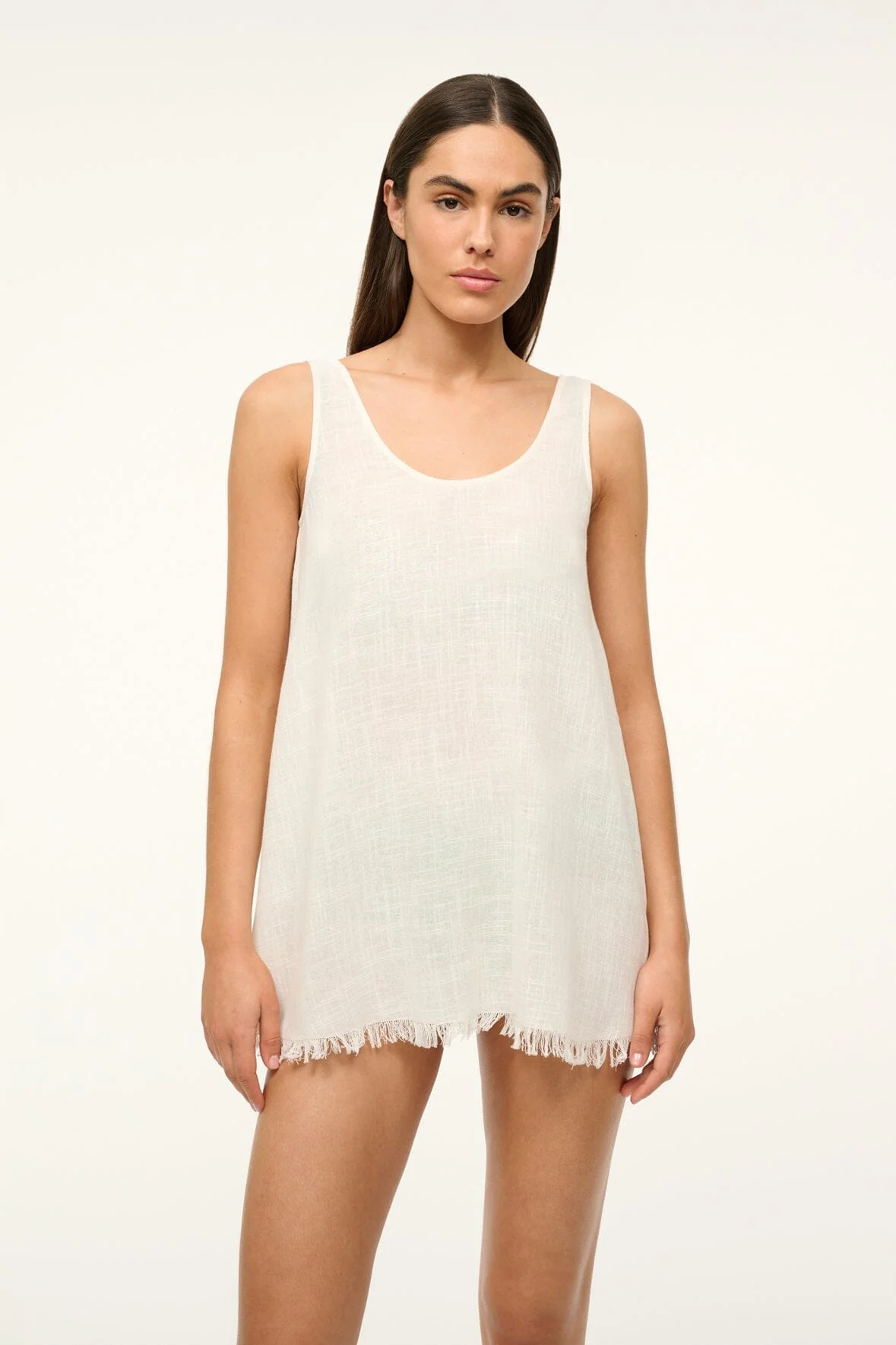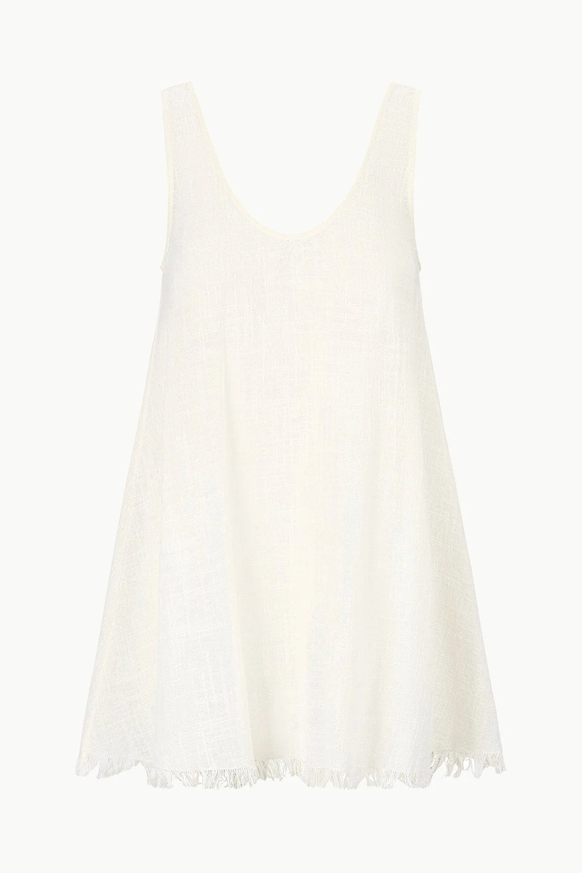 The Tillie Cover-up Dress is a micro mini style, in a sheer gauze fabrication and features a frayed hem.