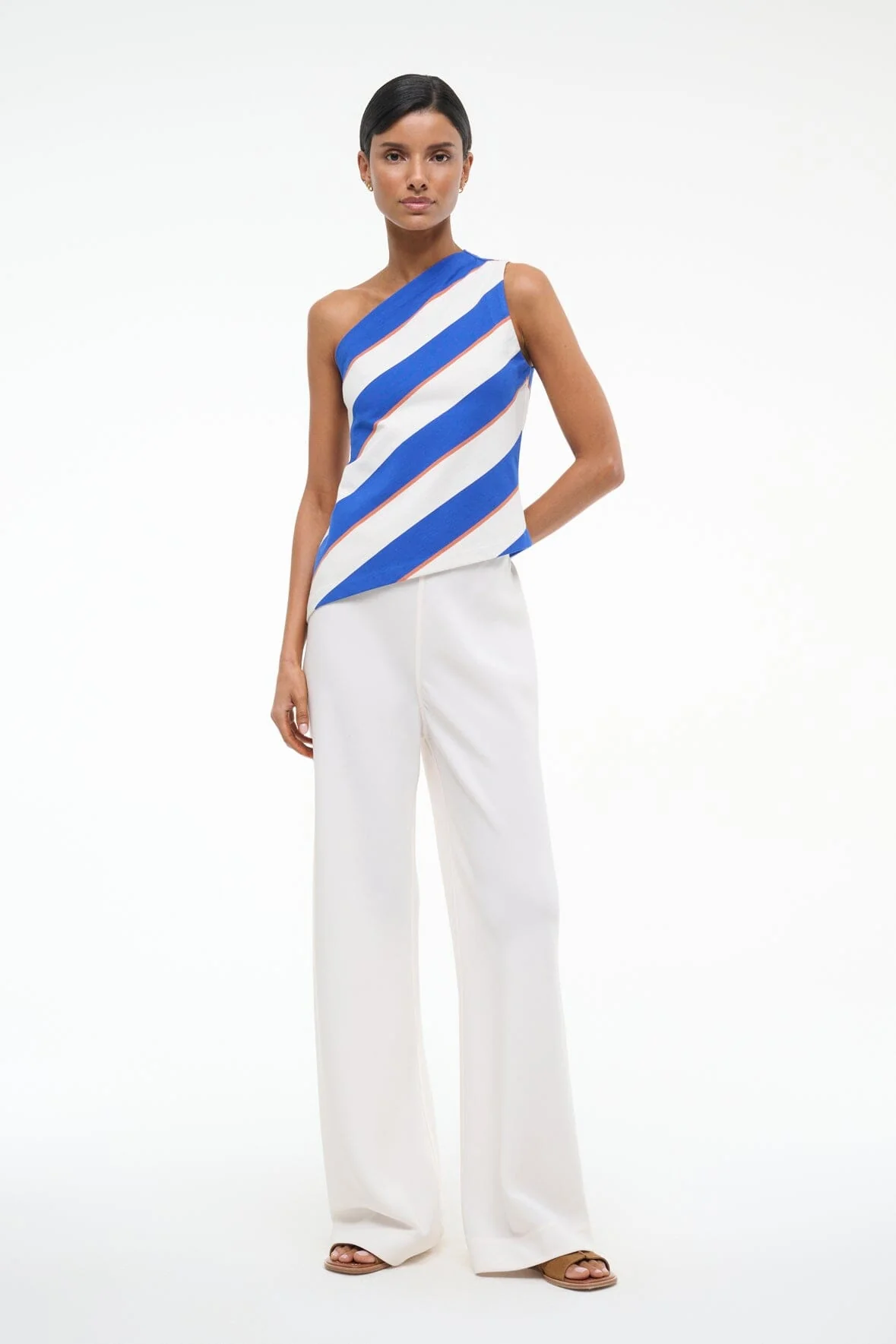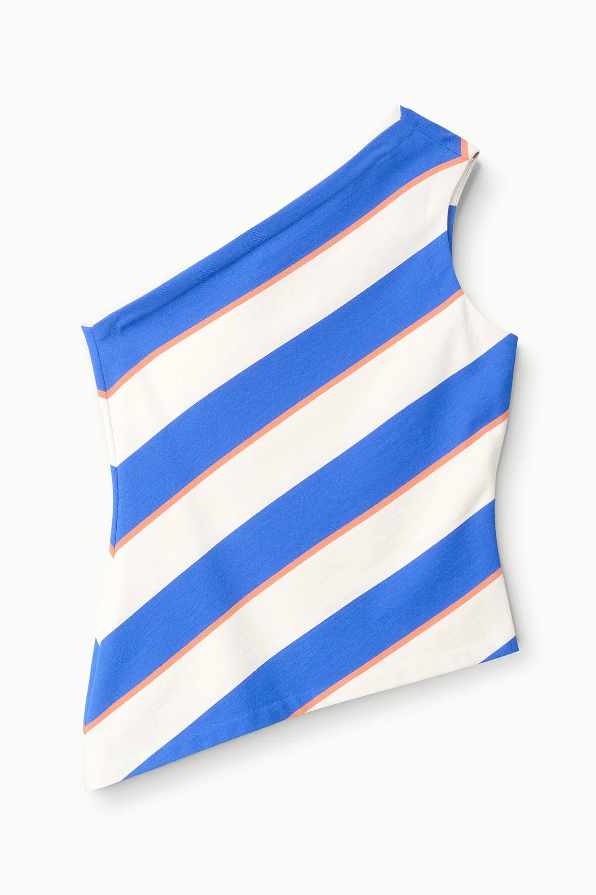 The Esme Top is a one shoulder sleeveless jersey top, featuring an asymmetrical hem, in our seasonal rugby stripe.