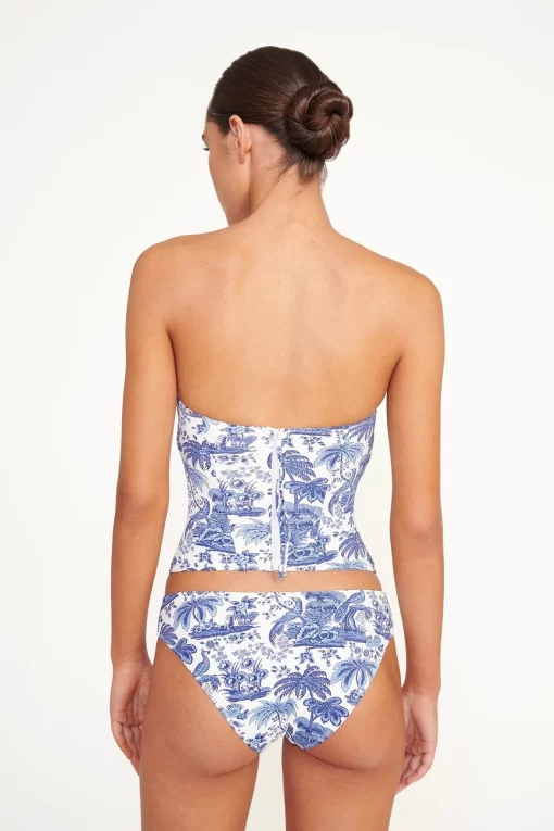 The Francesca Top is a corset-inspired swim top with boning throughout the bodice and a zipper at the back. This style is strapless and offers torso coverage as an alternate to a bikini top.