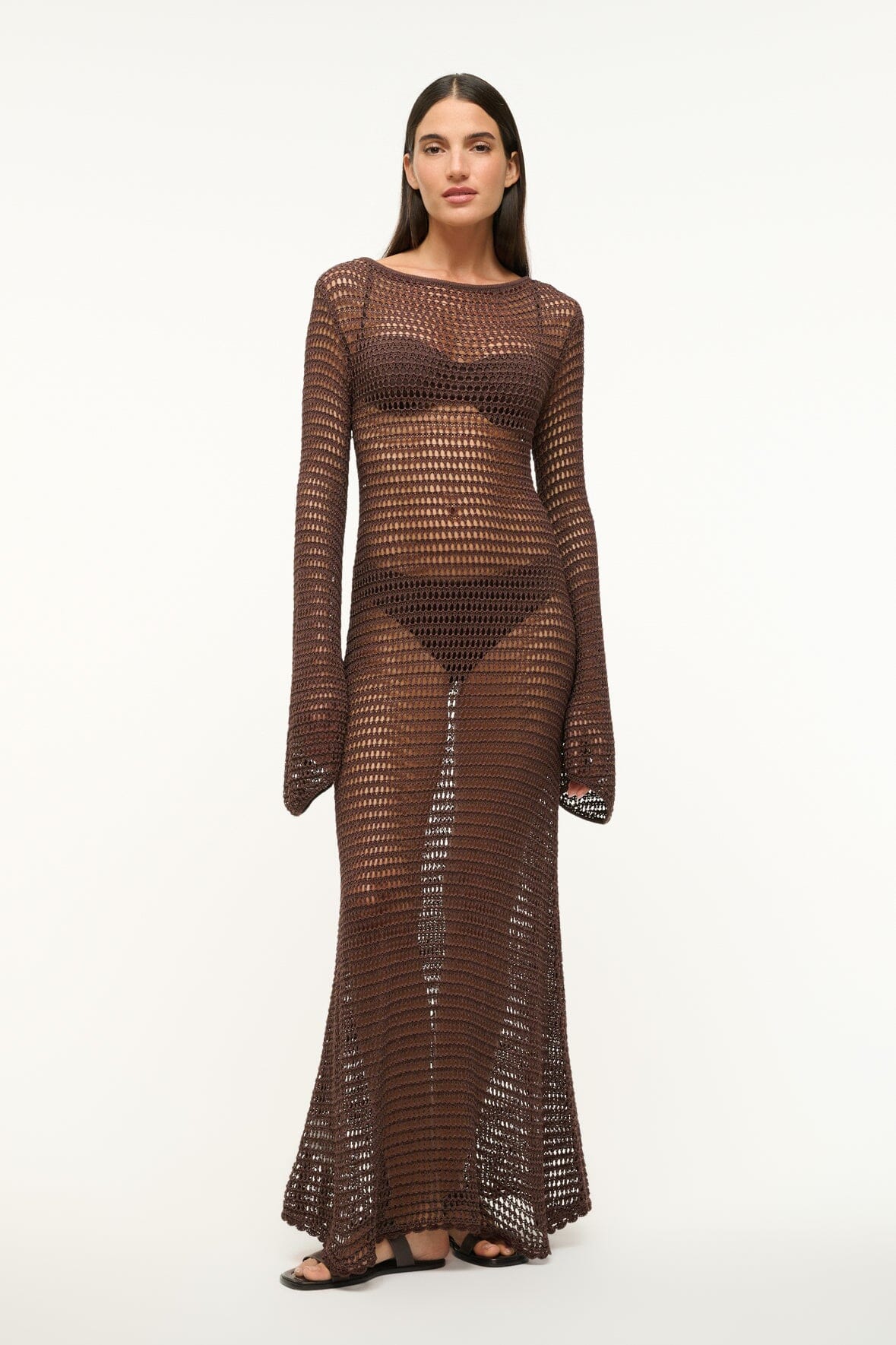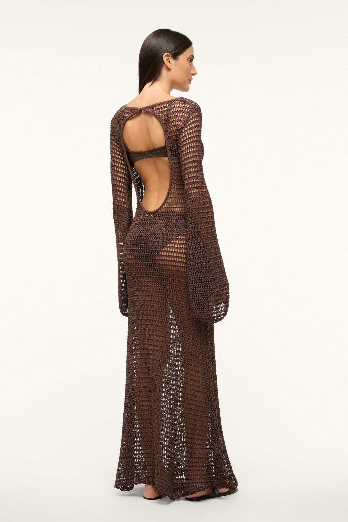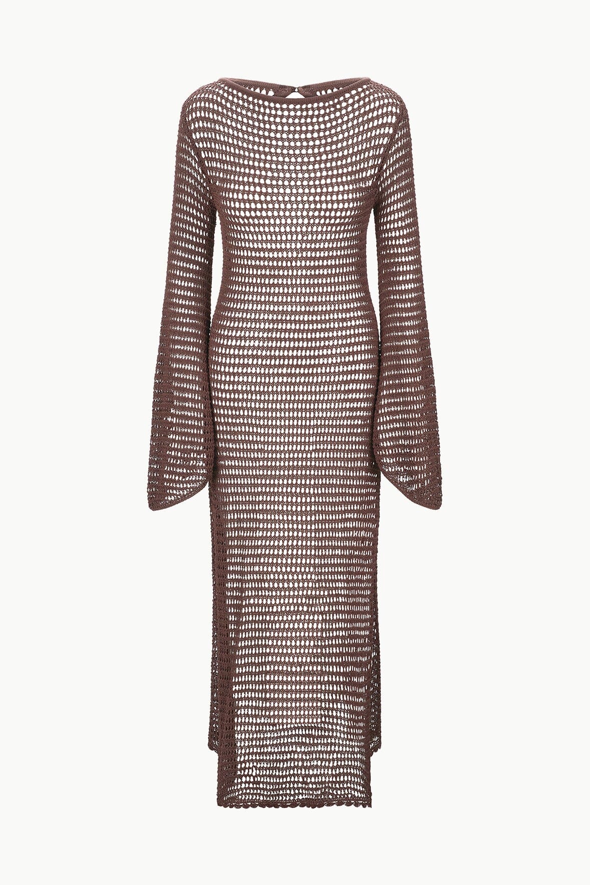 The Lorena Dress is a new maxi crochet dress, featuring a boat neckline and an open back. This style features a button closure at the neck, flared bell sleeves, and has an open weave.