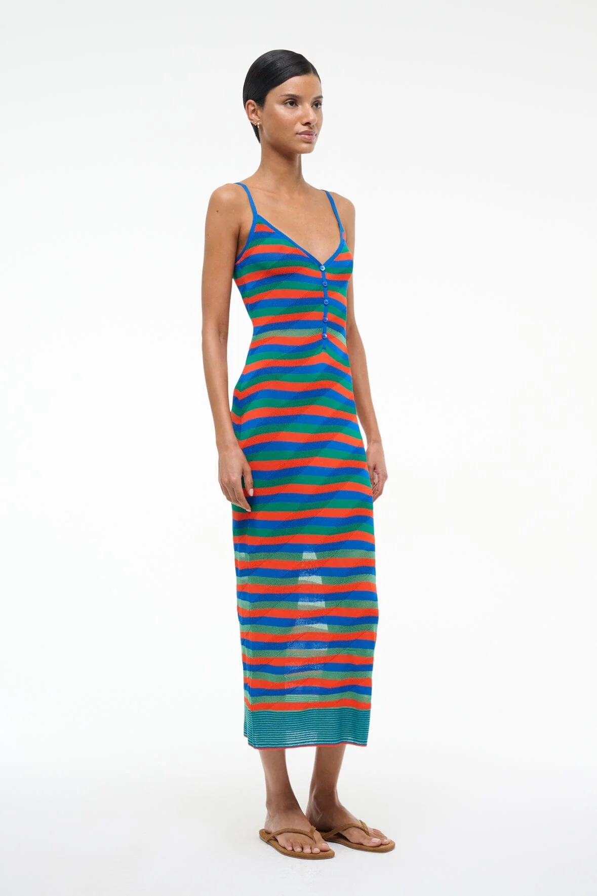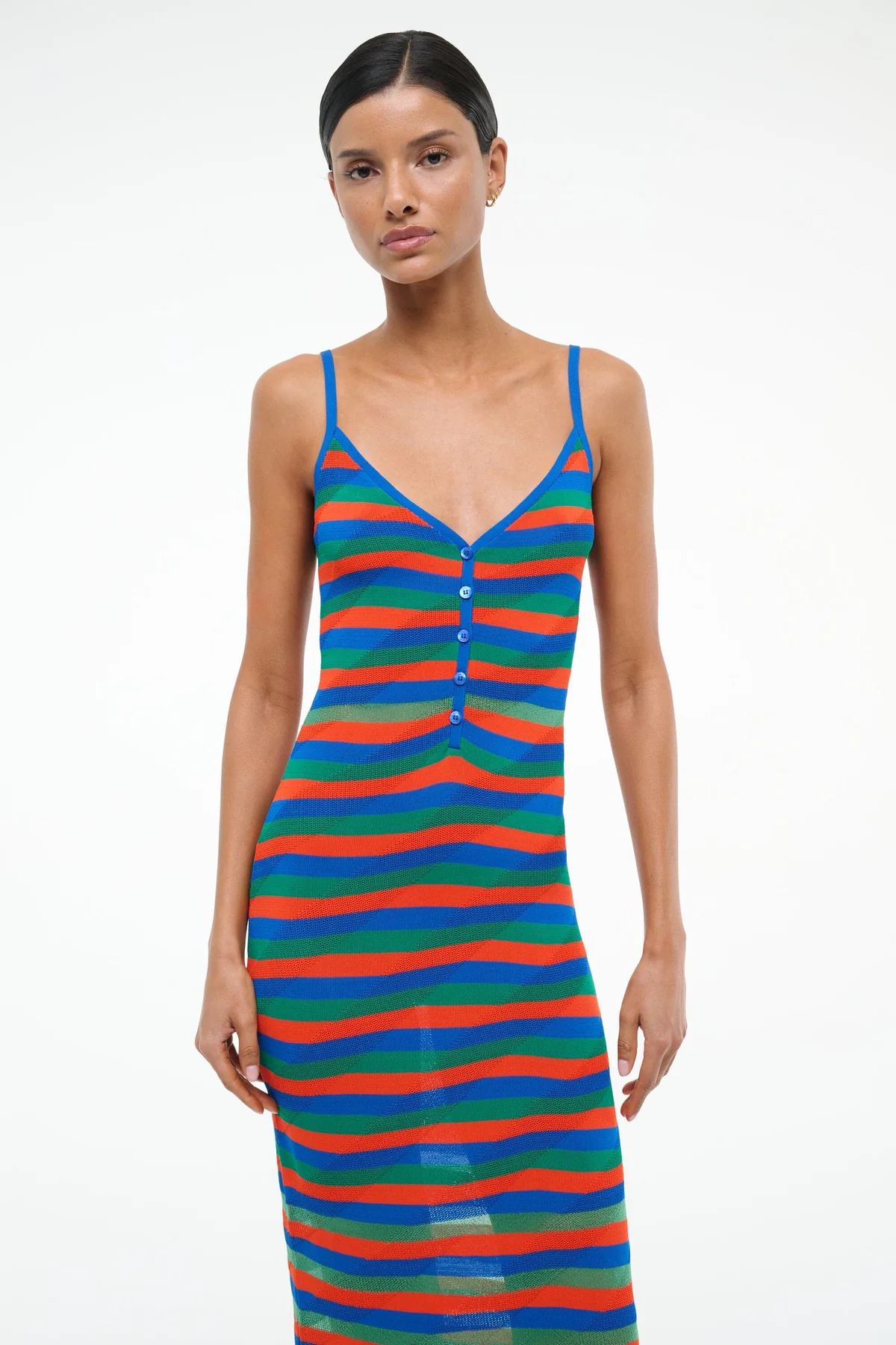 Delmare is an easy knit daydress featuring a sheer striped pattern. This style has a v-neckline, front button detailing, and spaghetti straps.