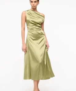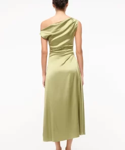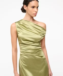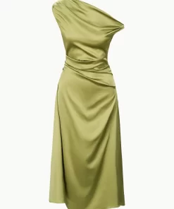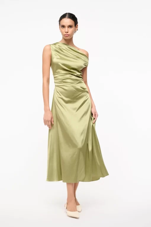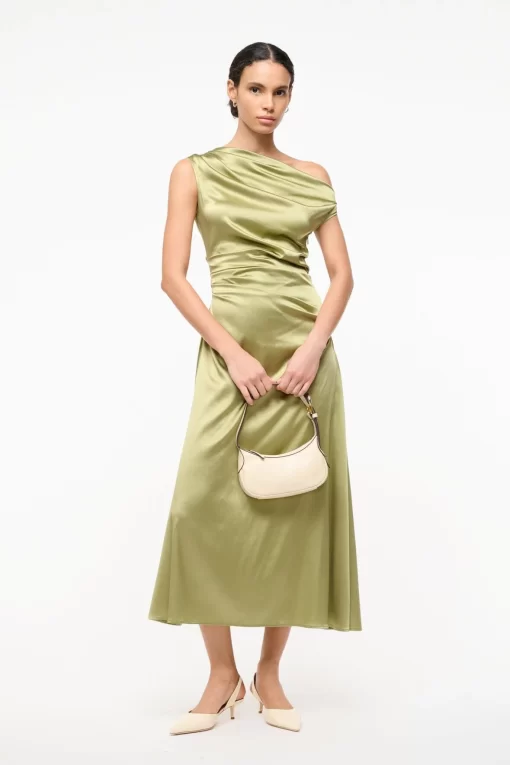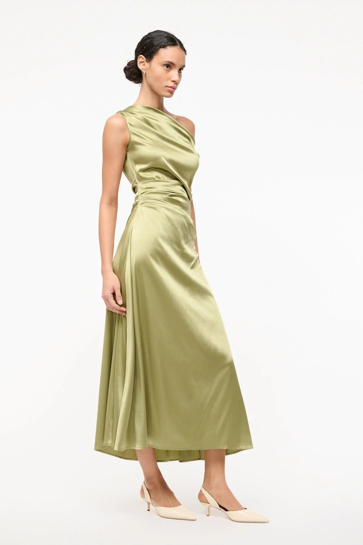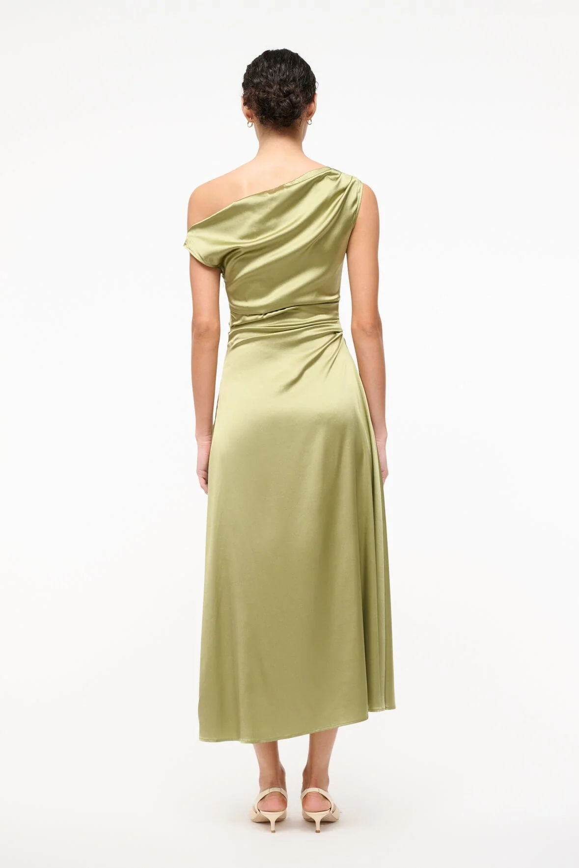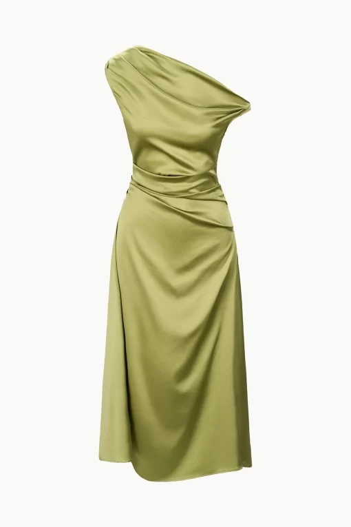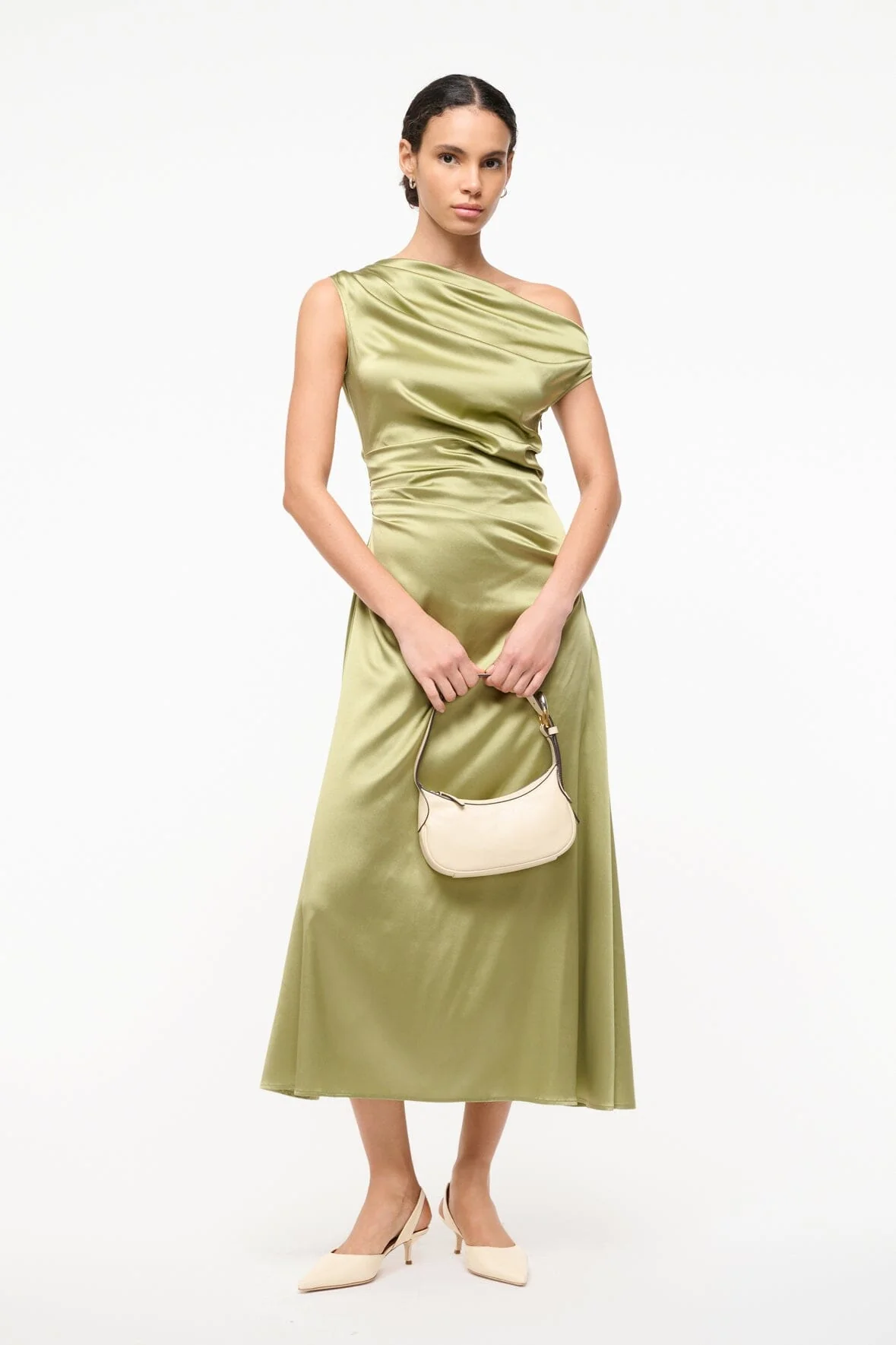 The Phare Dress features a draped off-the-shoulder neckline, a fitted waist and an ankle-grazing length. Updated in our stretch silk, this dress is perfect for a special occasion.